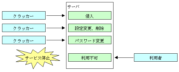 不正侵入とは、サーバソフト及びOSのバグによるセキュリティホールを悪用することで、不正にサーバにログインすることです。侵入されると、CPUやDISKなどのリソースを使われたり、機密情報を盗まれたり、データを消去されたりすることがあります。