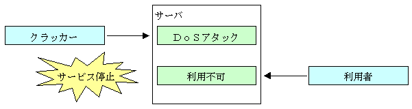サービス停止は、DoS(Denial of Service)アタックとも呼ばれています。標的の機器(サーバやルータ、クライアントのマシンなど)をハングアップさせたり、ネットワークのトラフィックを増大させたりして、ネットワークの機能を麻痺させたりします。