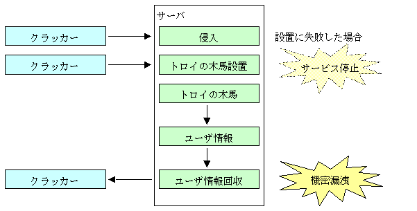 トロイの木馬とは、サーバにユーザ情報を盗聴するなどの罠をしかけることです。ログインモジュールをフックすることで、ユーザ名やパスワードなどをファイルに保存し、後で回収することができます。