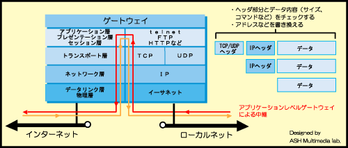 アプリケーションレベルゲートウェイでは、ftpやpopやtelnetなどのコマンドを認識し、不正なコマンドは中継しないようにすることができます。